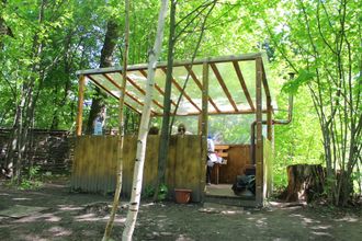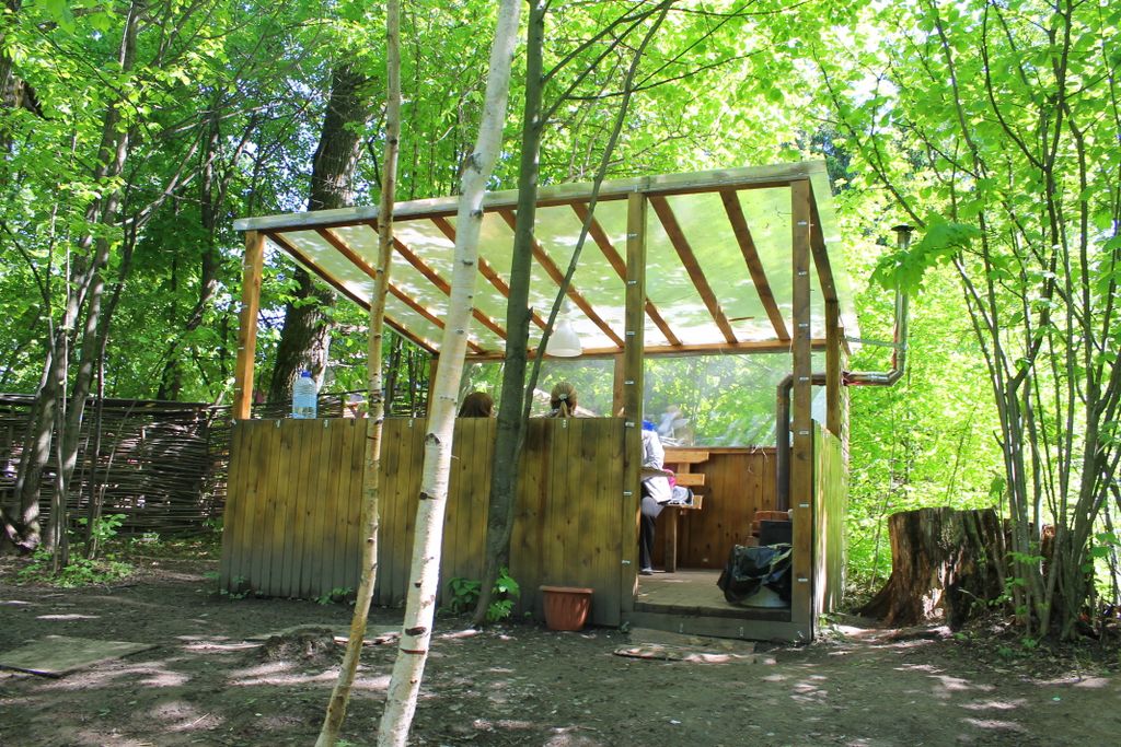 Беседка имеет укрытие от ветра и рассчитана до 20 человек. Из беседки открывается шикарный вид на пруд. В беседке имеются две лавочки, стол, есть печка, свет. Рядом с беседкой висит рукомойник, стоит мангал.